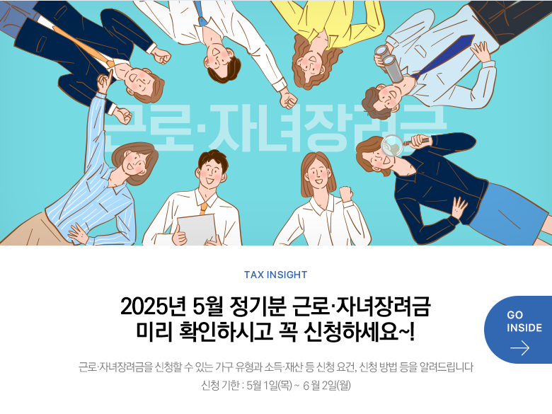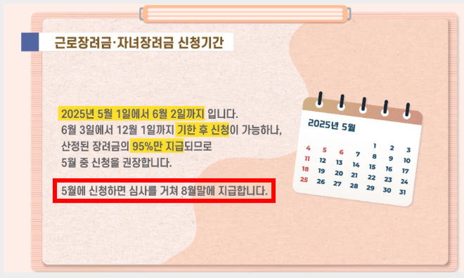 2025년 5월 1일부터 6월 2일까지 2024년 귀속 정기분 근로·자녀장려금 신청 기간입니다.