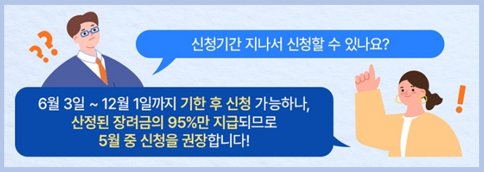 기한 후 신청할 경우 5% 감액되어 산정된 장려금의 95%만 지급된다는 점을 유의하시기 바랍니다.
