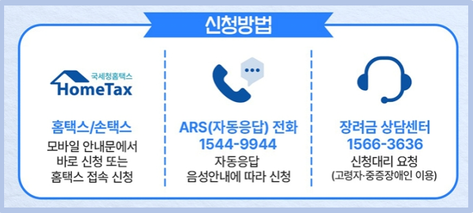 '홈택스', '자동응답서비스 1544-9944', '장려금 상담센터 1566-3636'에서도 확인할 수 있으며