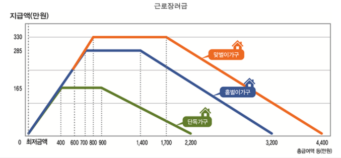 가구유형에 따른 근로 장려금 지급 가능액은
