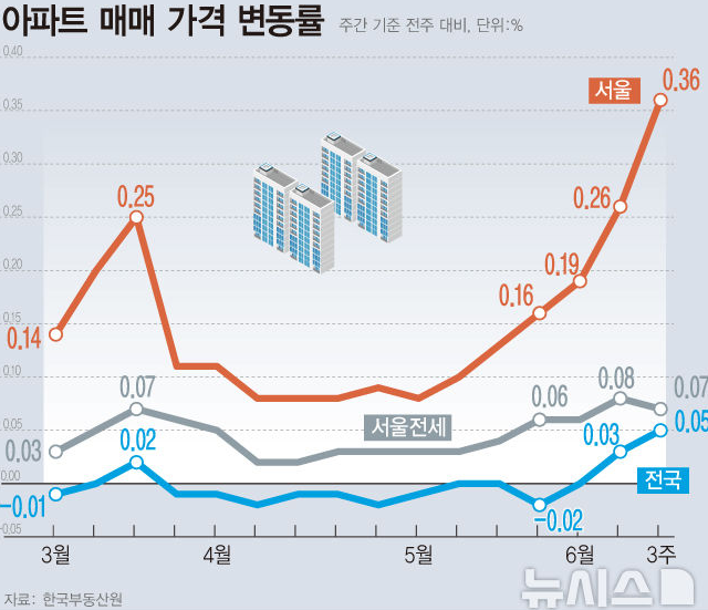 한국부동산원에 따르면, 6월 셋째 주 기준 서울 아파트 매매가격은 전주 대비 0.36% 상승했으며,
