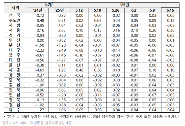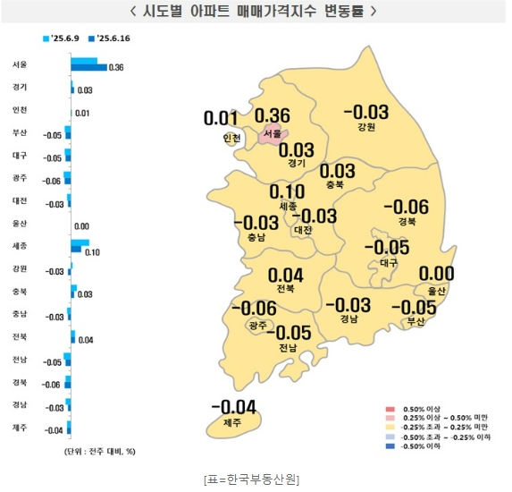 한국부동산원에 따르면, 6월 셋째 주 기준 서울 아파트 매매가격은 전주 대비 0.36% 상승했으며,