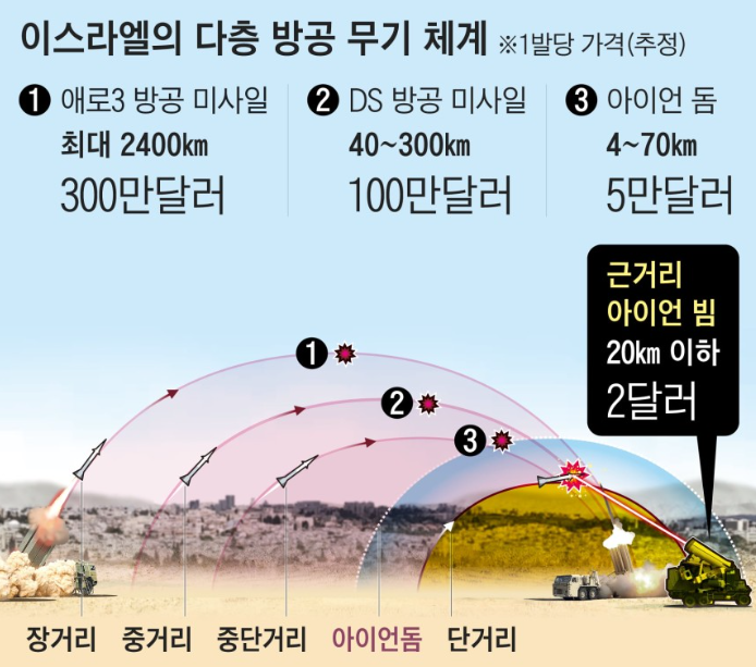- 아이언 돔: 민간 지역에 떨어지는 로켓/박격포/단거리 미사일에 대응 → 도시 방어, 이스라엘형 비대칭 전투에 최적
