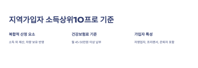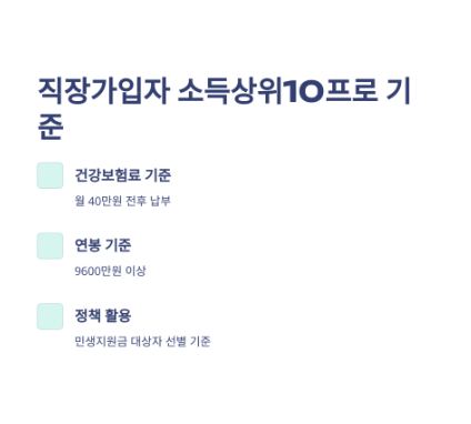 따라서 월급이 낮아도 고가 부동산·자동차 등 자산 보유 시 상위 10%로 포함될 수 있습니다.