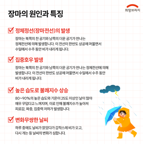 장마는 북쪽의 찬 공기와 남쪽의 따뜻하고 습한 공기가 만나는 ‘정체전선(장마전선)’ 때문에 발생합니다.